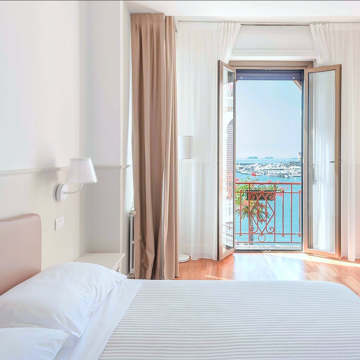 Recentemente ristrutturata e finemente arredata, la stanza è illuminata da un'ampia finestra che affaccia direttamente sul panorama del mare di Rapallo.